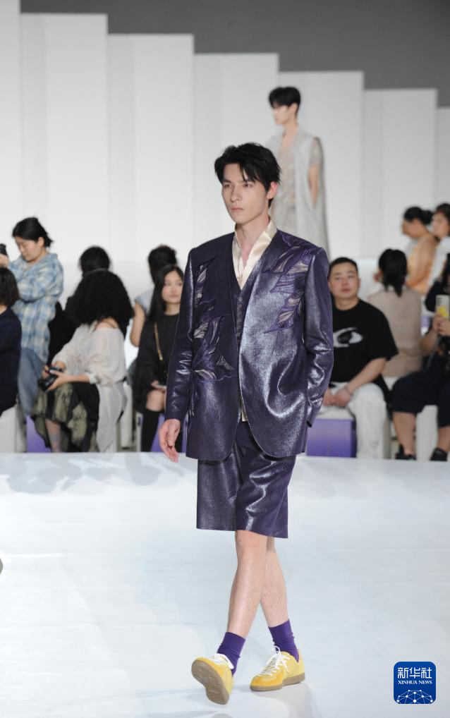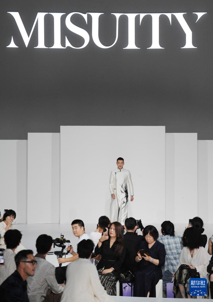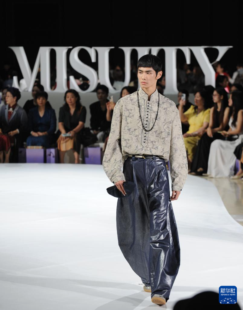 9月5日,模特胡兵在北京举行的2025中国国际时装周(秋季)开幕大秀上展示国奢品牌米休缇SS26系列时装。
