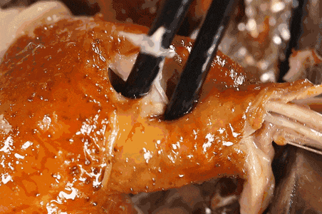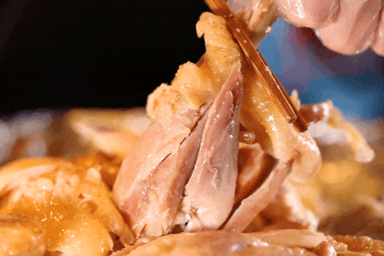 色泽金黄油亮,油脂逼进肉纤维,鸡肉一撕成丝,酥香中带着肉汁爆出,软嫩却不腻~香啊~